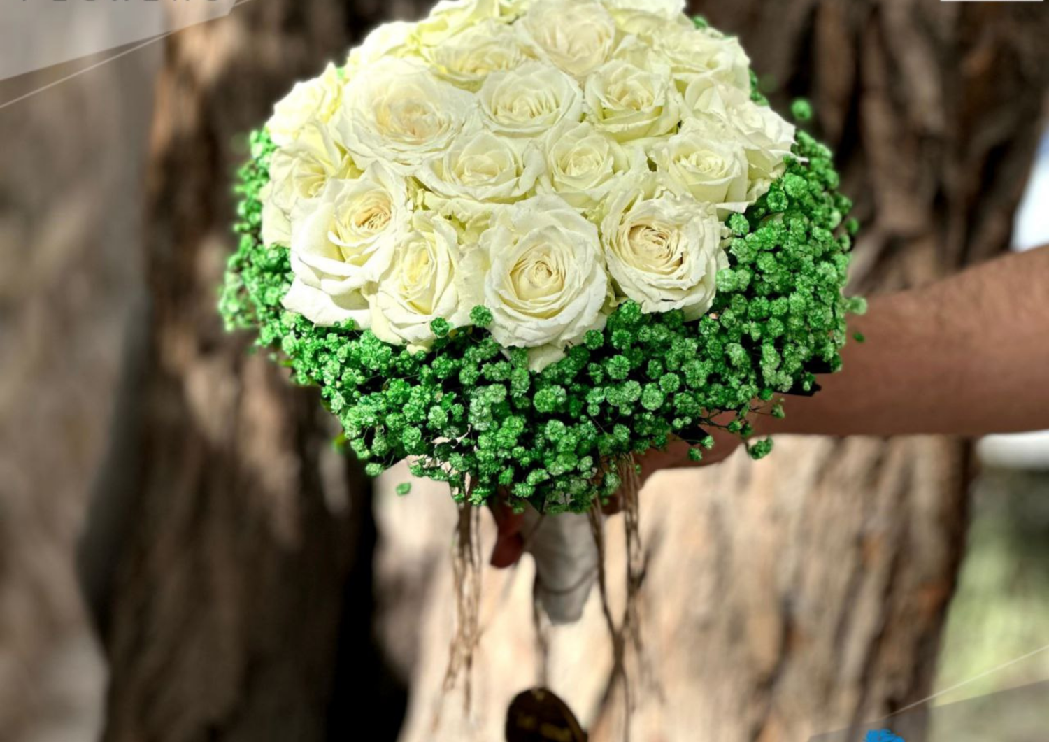 باقة ورد ابيض محاطة بورد اخضر باقة مصنوعة من ورد طبيعي