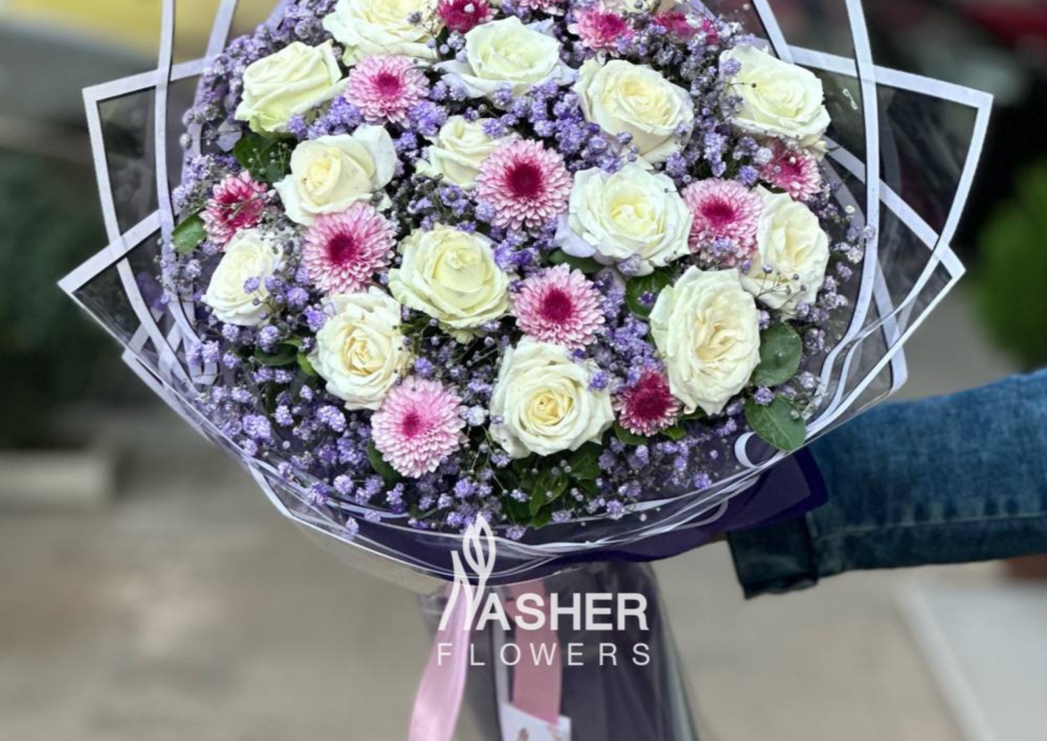باقة الورد عالي الجودة خليط بين لون البيض والزهري