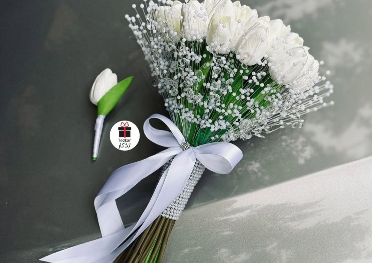 مسكة عروس من زهر التوليب يحيط به غلاف للباقة من غربول مزين ابيض عالي الجودة