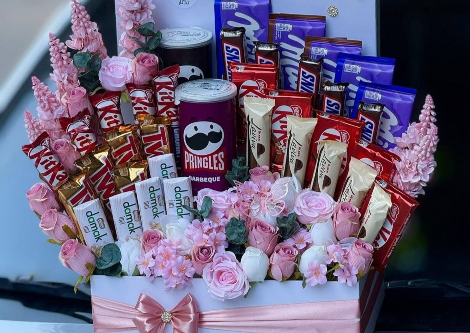 بوكس الحلويات مع الورد الزهري والابيض داخل بوكس ابيض من كرتون يحيط به شريط من ريبان لونه زهري فاتح