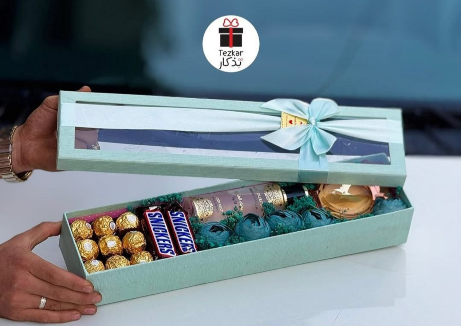 بوكس هدايا مستطيل شكل مصنوع من كرتون ولون اخضر مع ورد اصطناعي عالي الجودة مع شوكولا