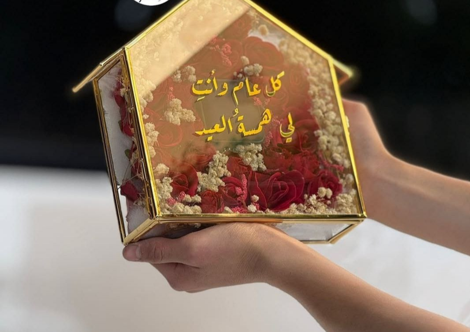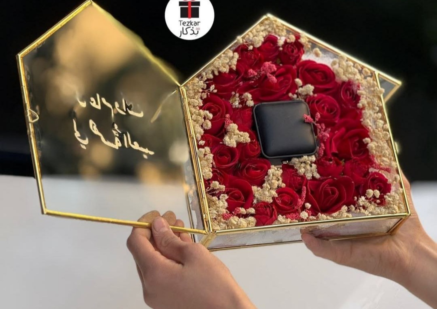 بوكس هدايا من بلور ويوجد داخله ورد احمر وعلبة خواتم سوداء من مخمل