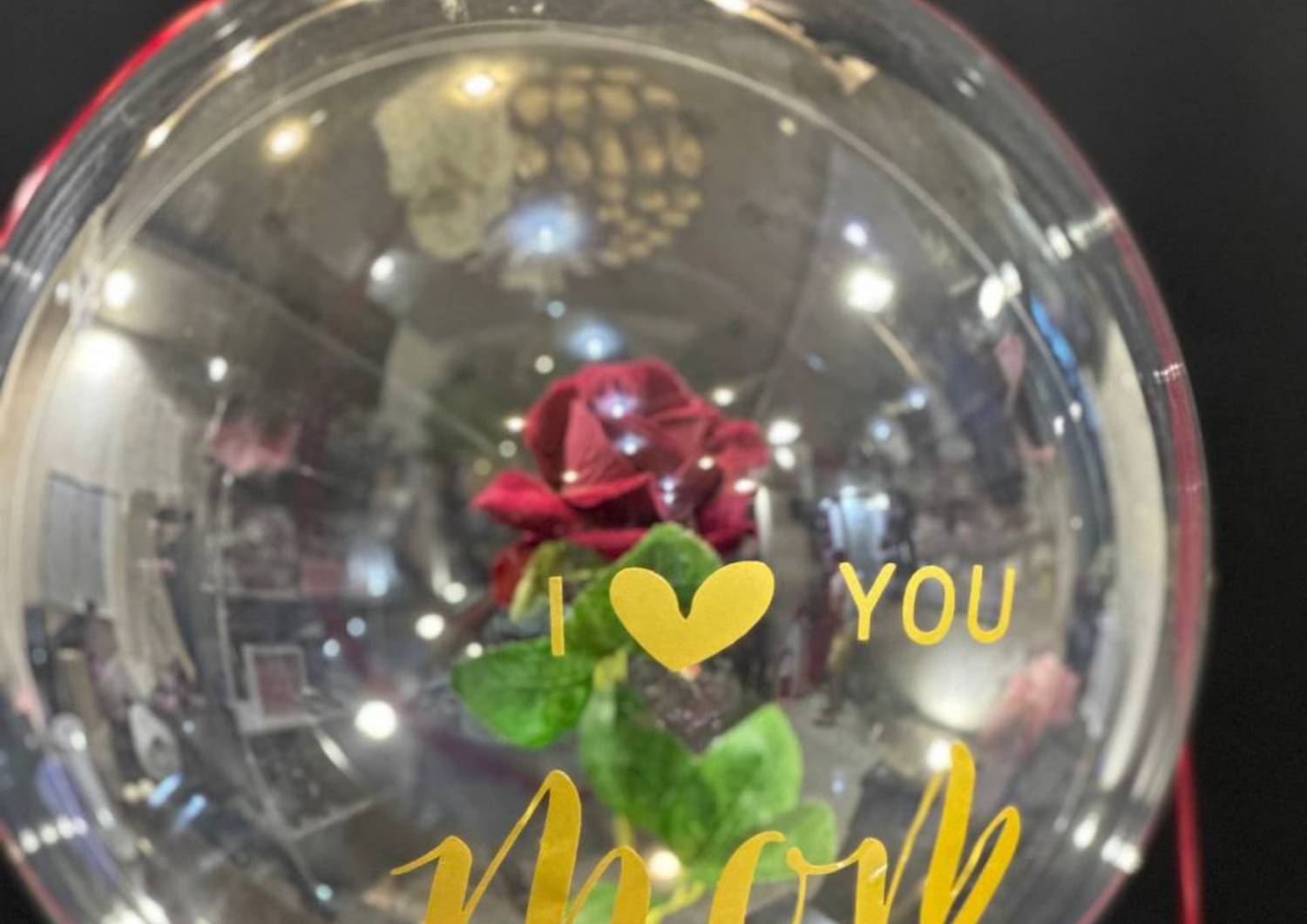 بوكس من الورد الابيض على شكل قلب مع بالون من هيليوم الشفاف بداخله وردة حمراء يمكن كتابة وتزيينها ب الون الاحمر وكتابة جملة حسب طلب