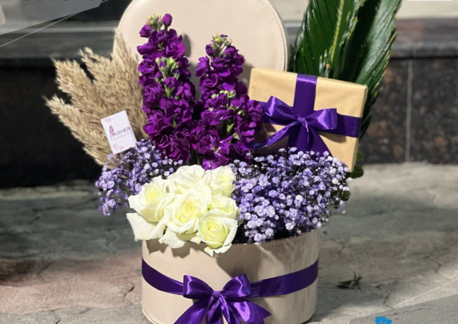بداخله ورد بنفسجي وابيض مع تدرجاته مع بوكسات اخرى للزينة