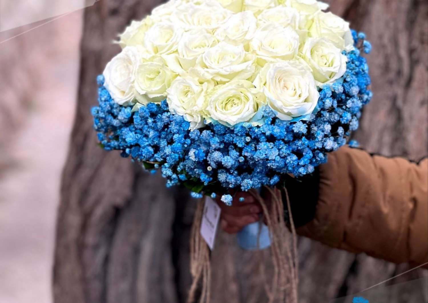 بوكيه لون ريشي من ورد طبيعي عالي الجودة ورد ابيض ملفوف على شكل دائرة يحيط به ورد ازرق من ورد فخم