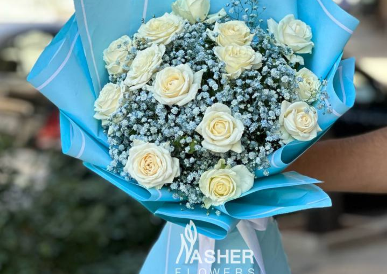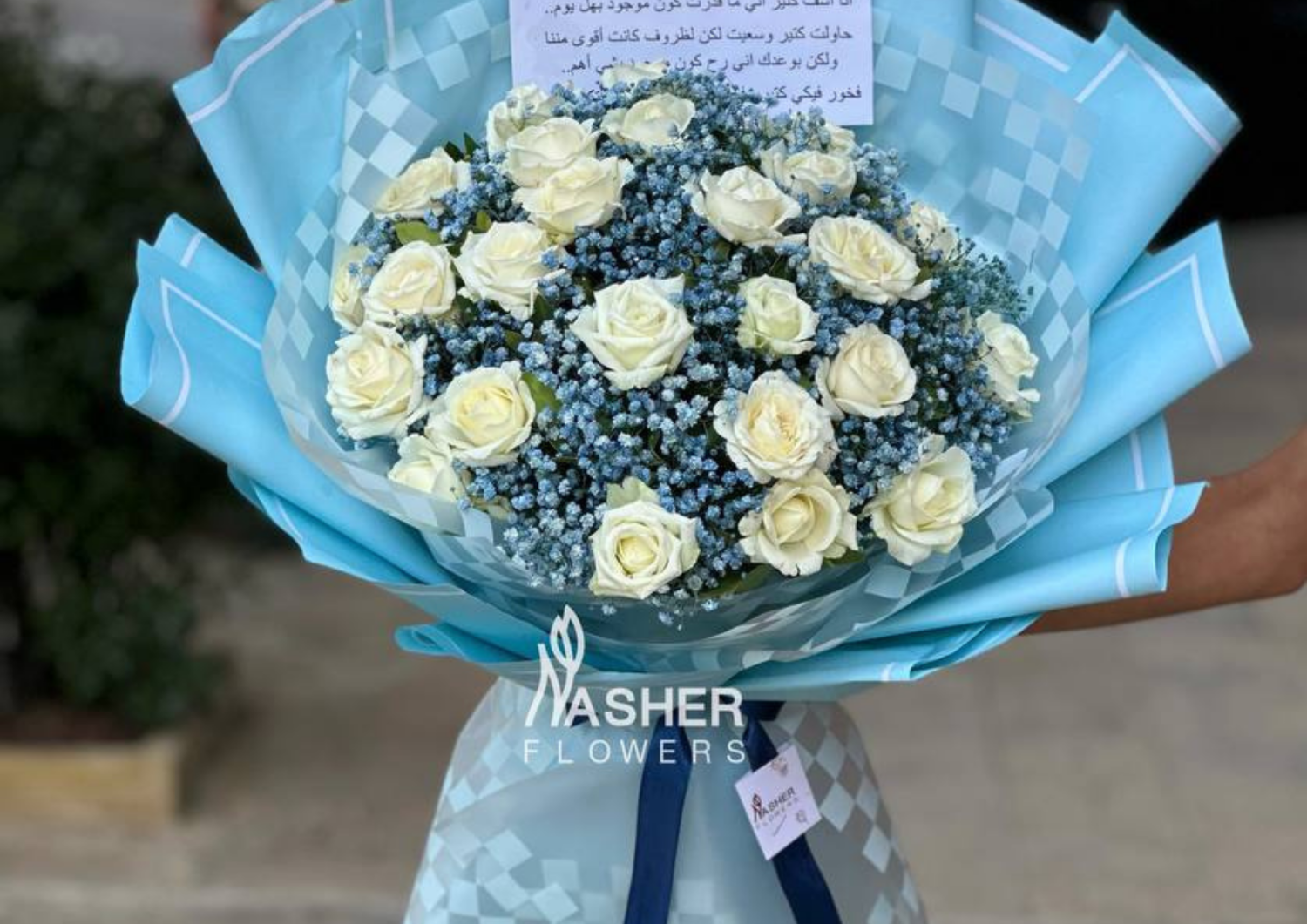 بوكيه ورد ريشي وابيض يكون الورد الابيض في المنتصف ويحيط به ورد ازرق