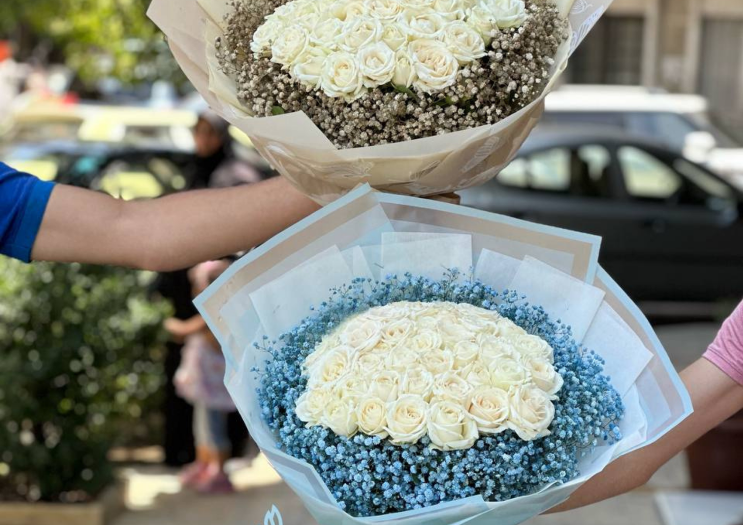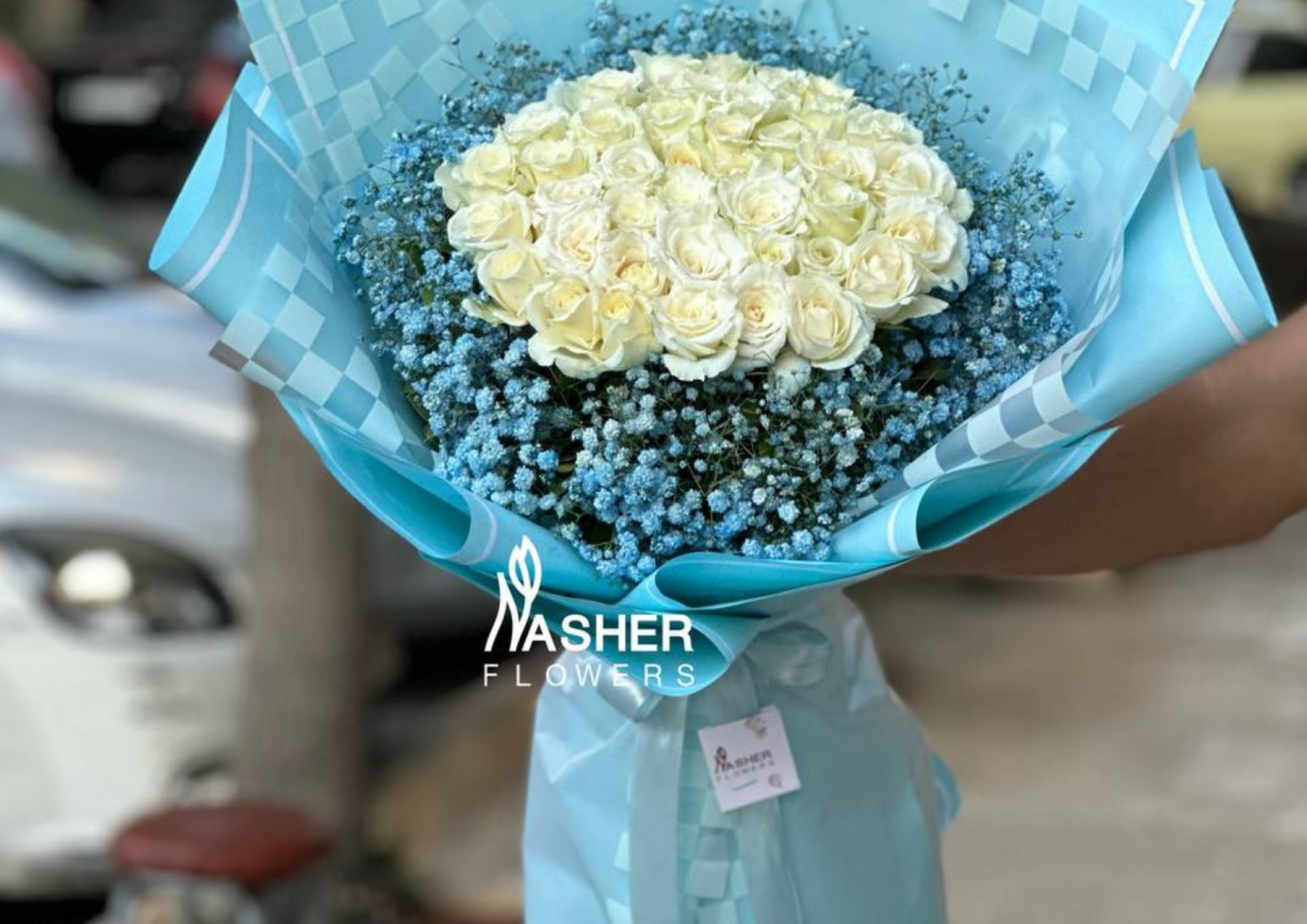 بوكيه من الورد الابيض الطبيعي يحيط به ورد ازرق يضيف له لمسة لطيفة وكي يظهر لون الابيض