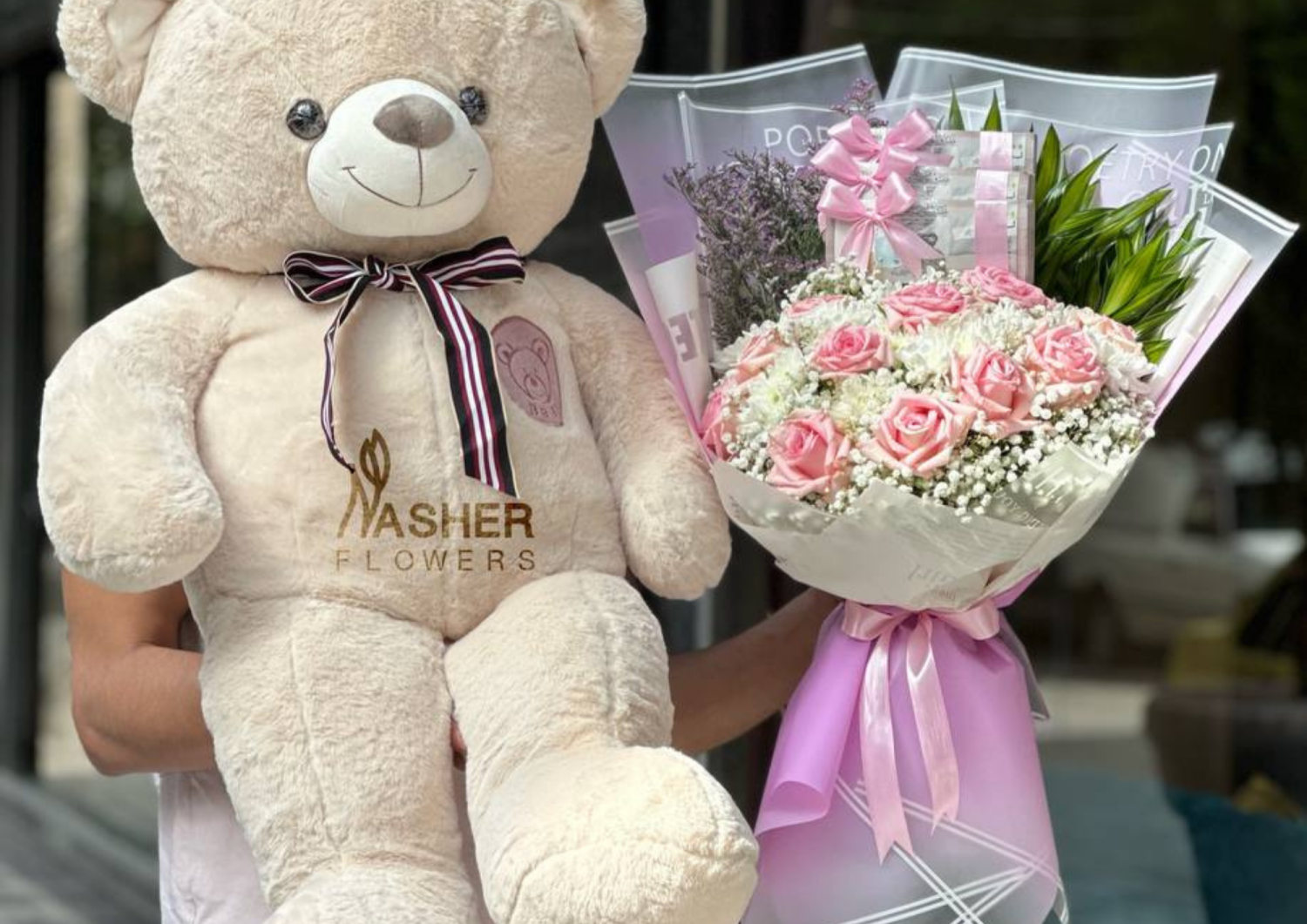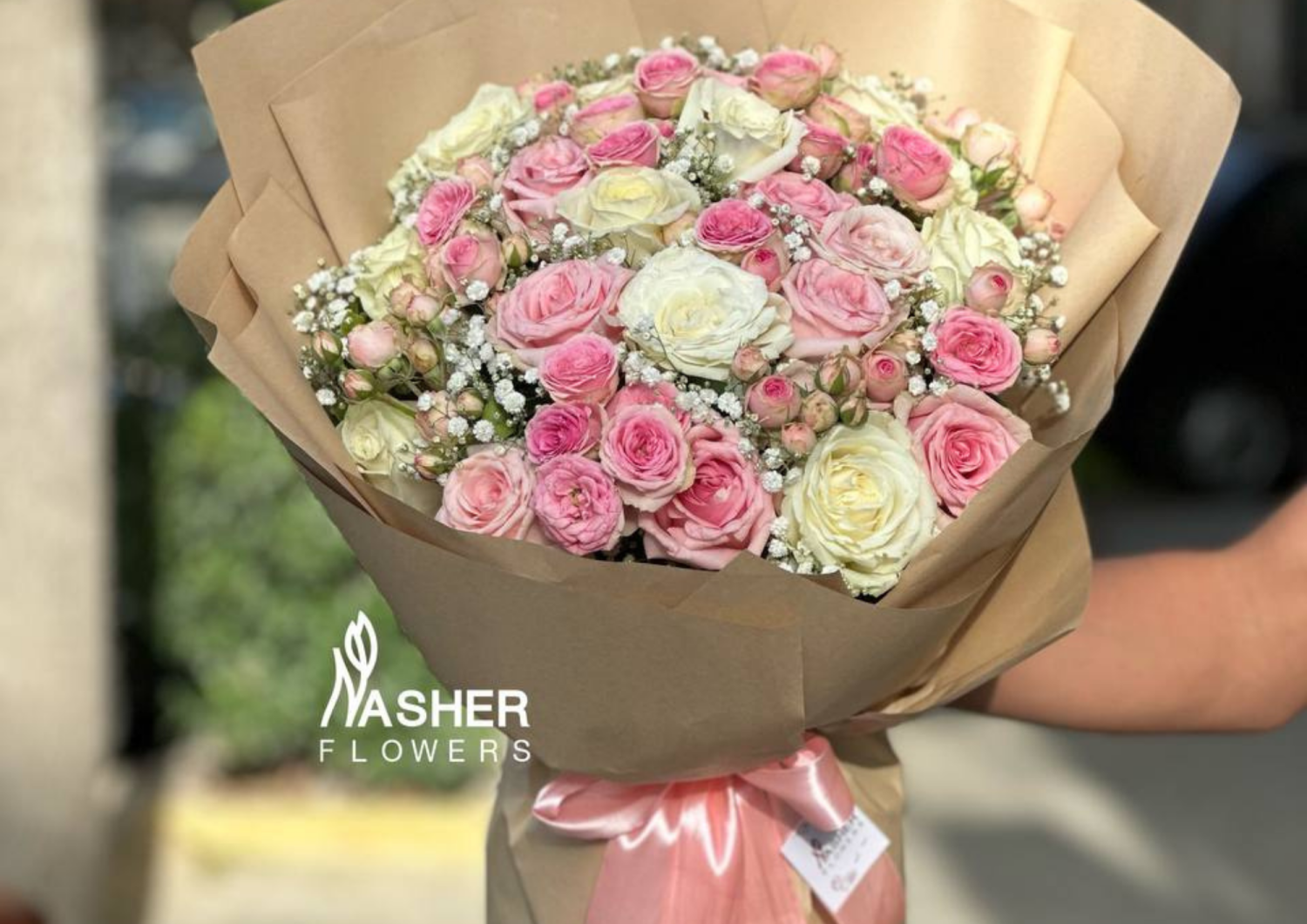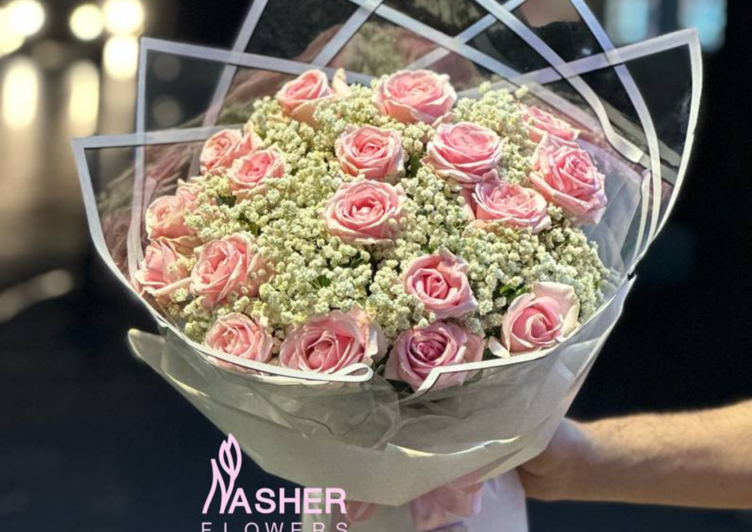 بوكيه الورد الزهري مع تغليف شفاف متناسق مع البوكيه