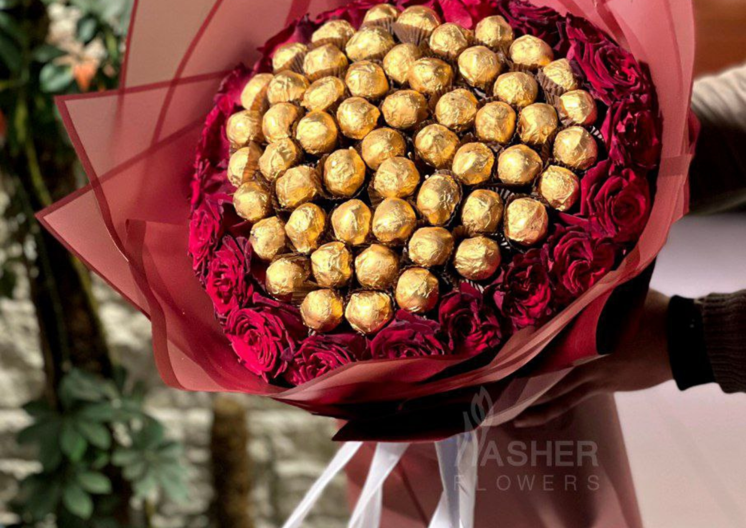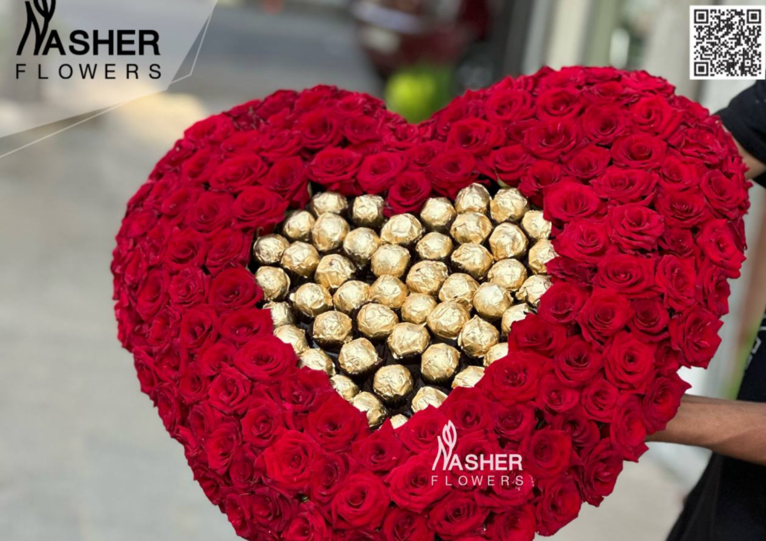 هدية باقة على شكل قلب او مدورة من الورد الاحمر والشوكولا