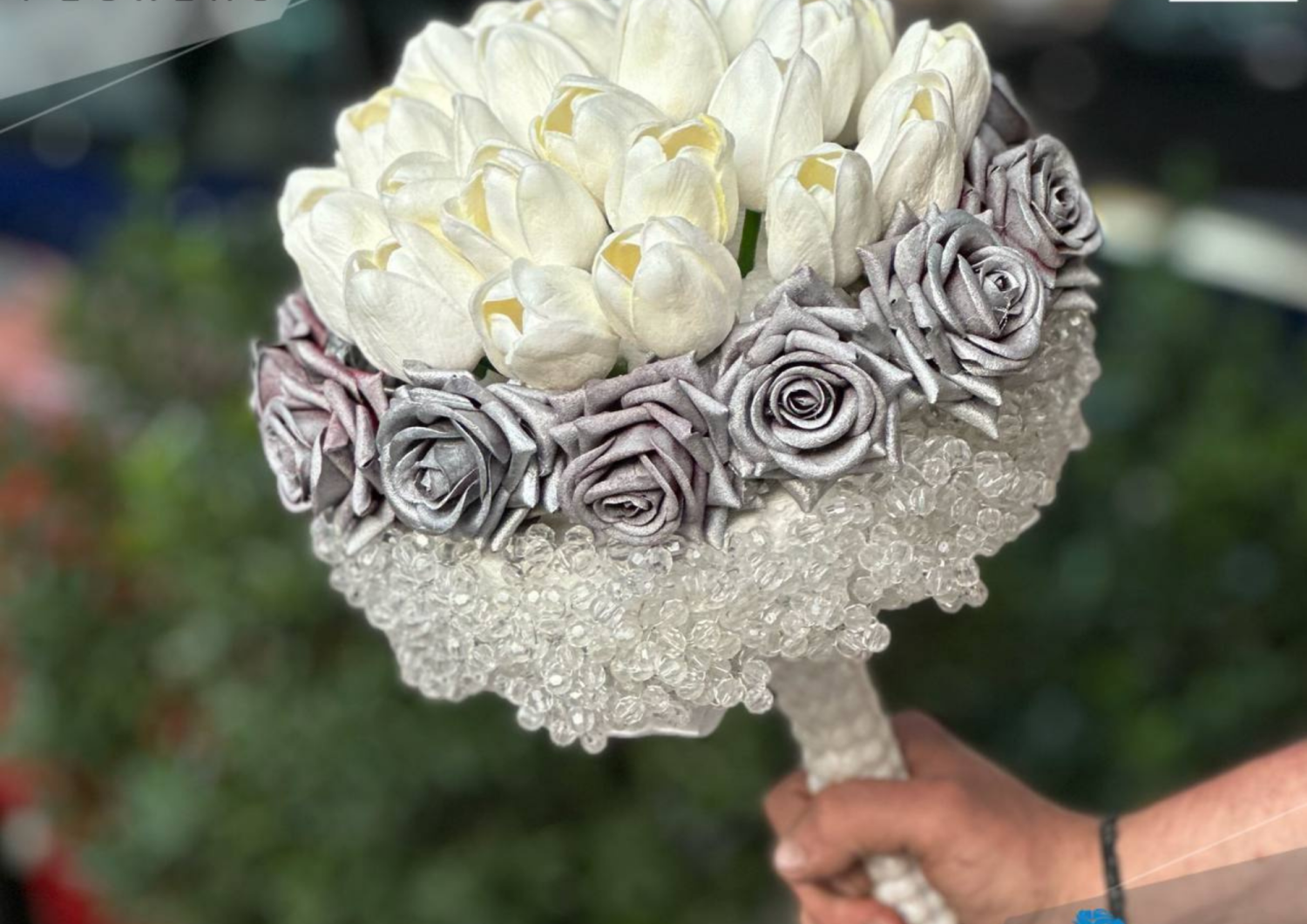 مسكة عروس بوكيه ورد ابيض مميز طبقة من الورد الابيض الطبيعي يليها طبقة من الكريستالات الفاخرة وورد ابيض اصطناعلي عالي الجودة