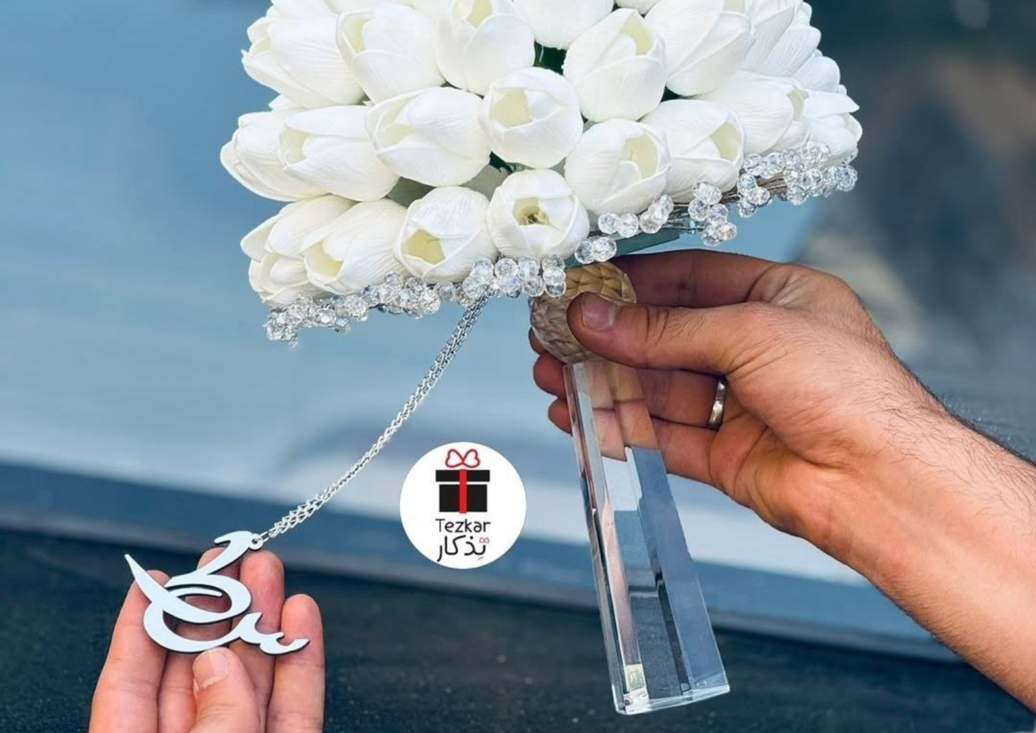 مسكة عروس من زهرة توليب الابيض مع مسكة على شكل مضلع من بلور فاخرة