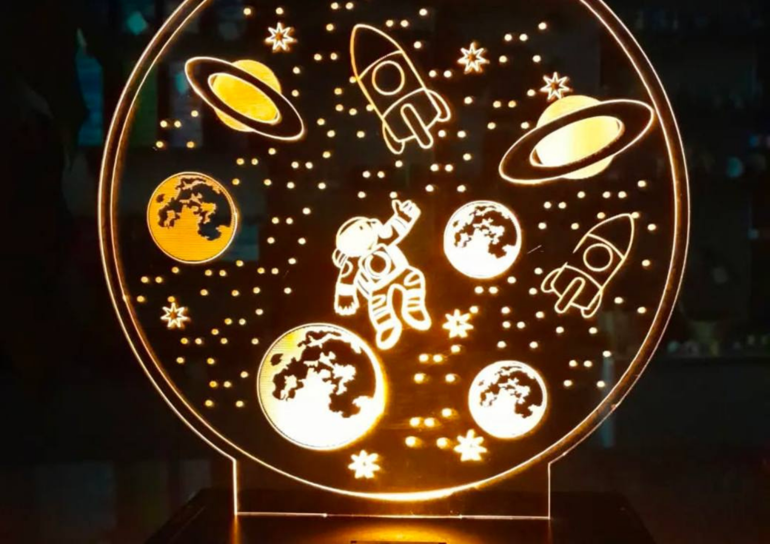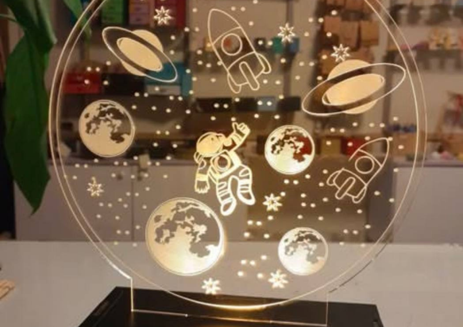 ستاند الفضاء المضيئ قاعدة خشبية مصطحة مع توفر لد من اجل اضاءة ويوضع في غرفة الاطفال من اجل جعل الغرفة هادئة ولطيفة