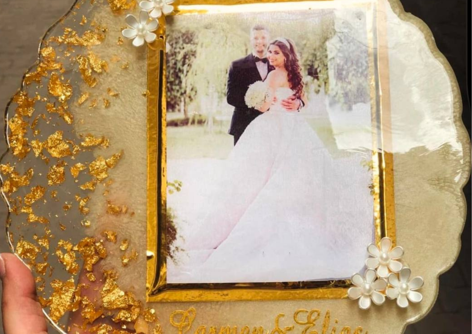 لوحة من الريزن تذكار الصورة مع وضع ورد التوليب الابيض معدة لتصبح ويمكن ان تضيف زينة وديكور للمكان