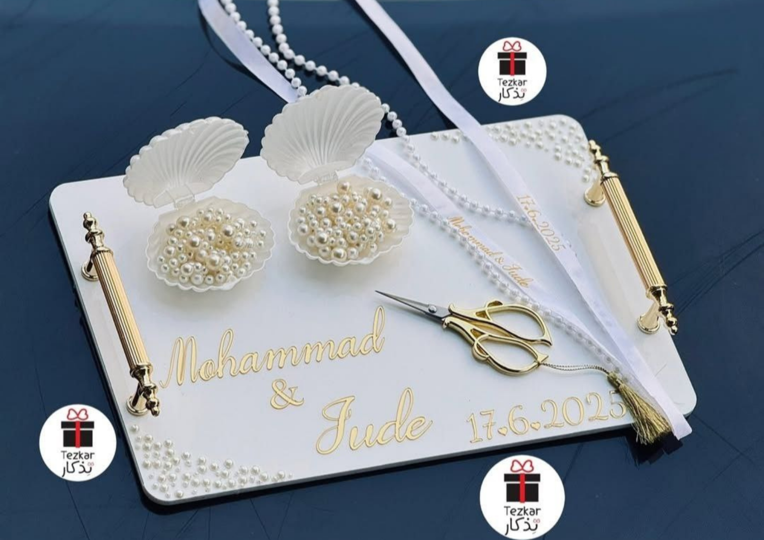 صينية محابس فاخرة يوجد علبتين للمحابس يوجد داخلهم لولو عالي الجودة مع ريبان ابيض ومقص ذهبي يمكن وضع اسامي عليها لون ذهبي