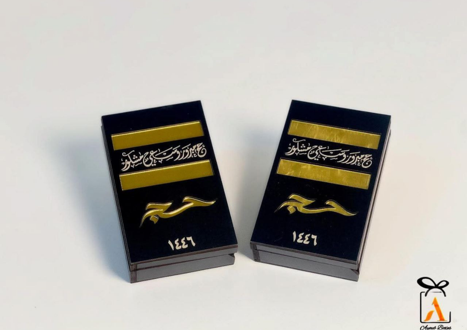 علب راحة توزيعات حج مكتوب باللون الذهبي لون العلبة اسود