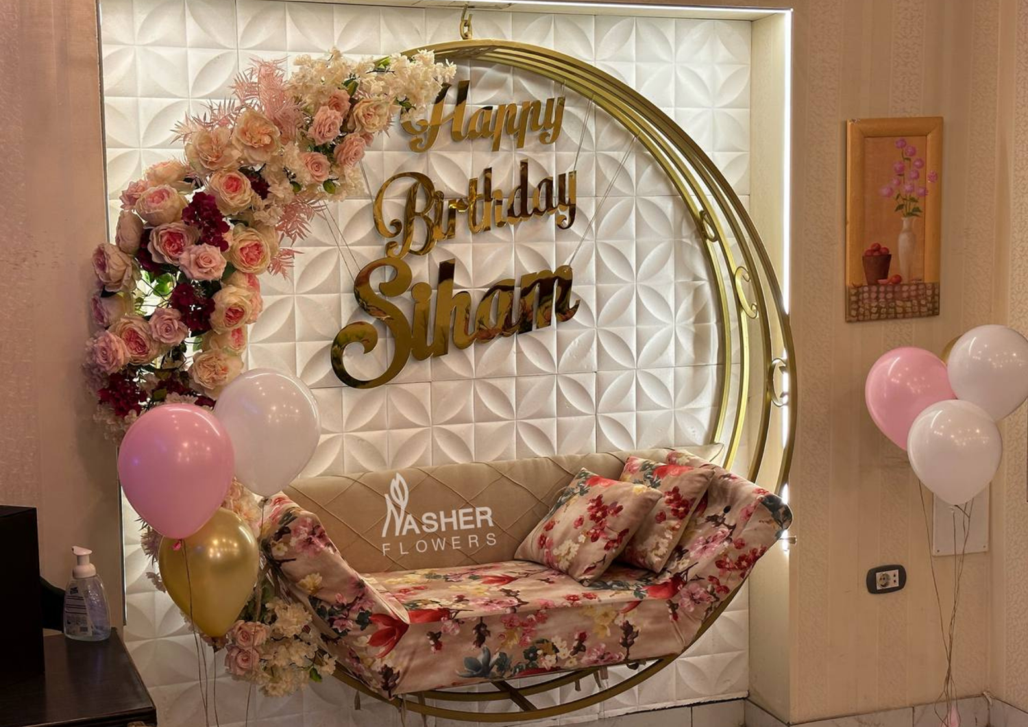 وكوشة دائرية من حديد لونها ذهبي مع نصفها الاخر من ورد ابيض وزهري فاخر